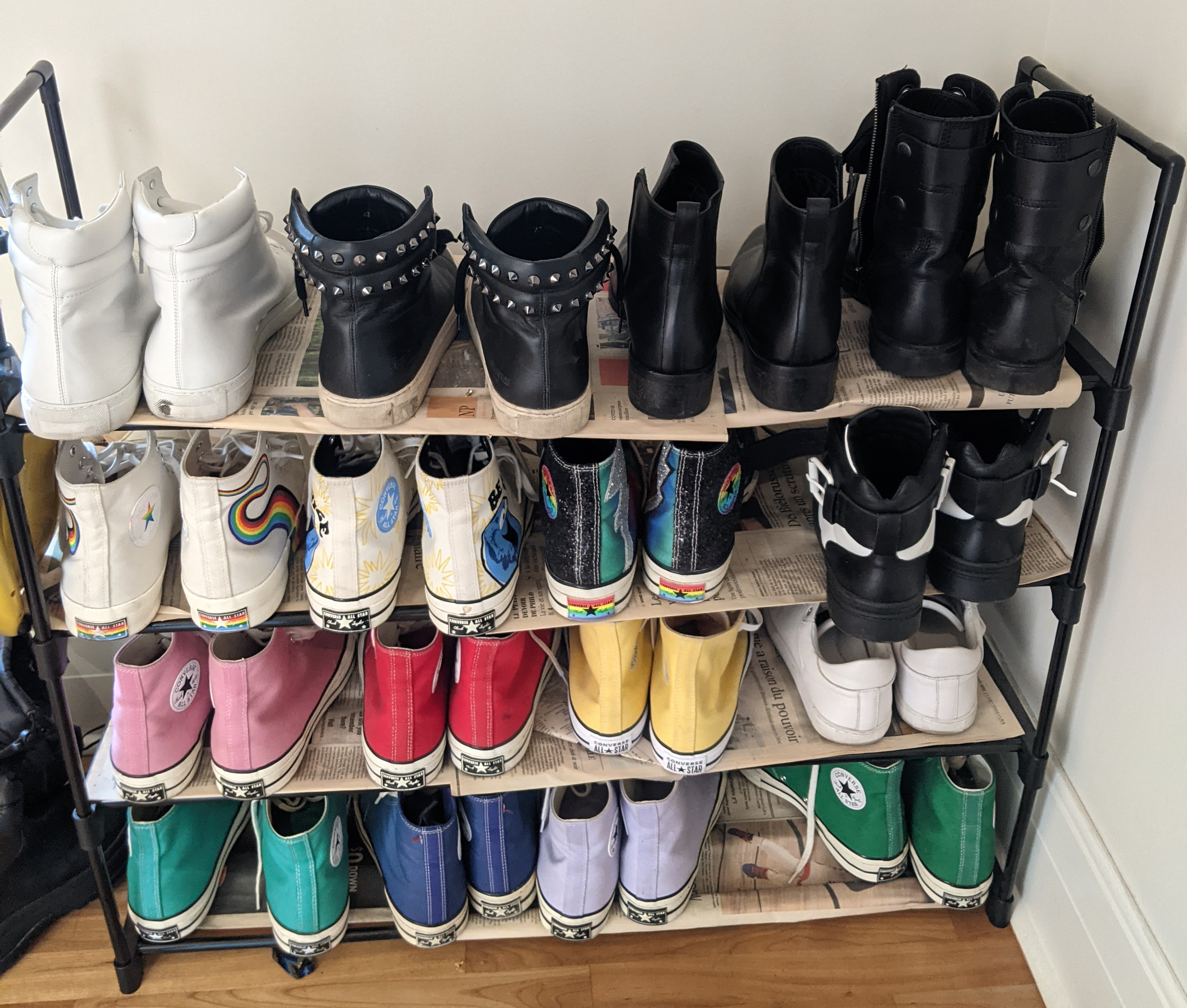 As you can see here my shoe rack contains literally a single pair of low top sneakers (the white ones) and the rest are all chuck 70s converse and a pair of combat boots.
