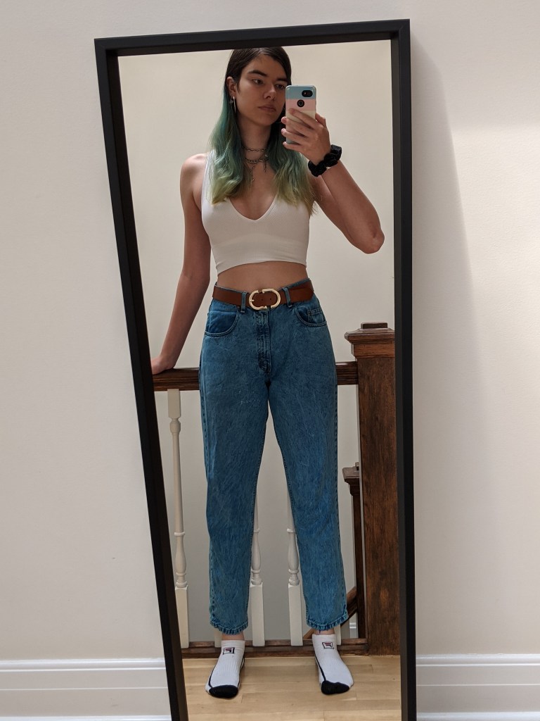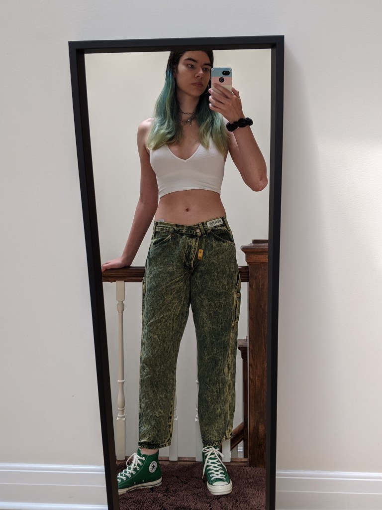 To image what a super high rise looks like there’s the pink jeans, vs a low rise on the lime pair.