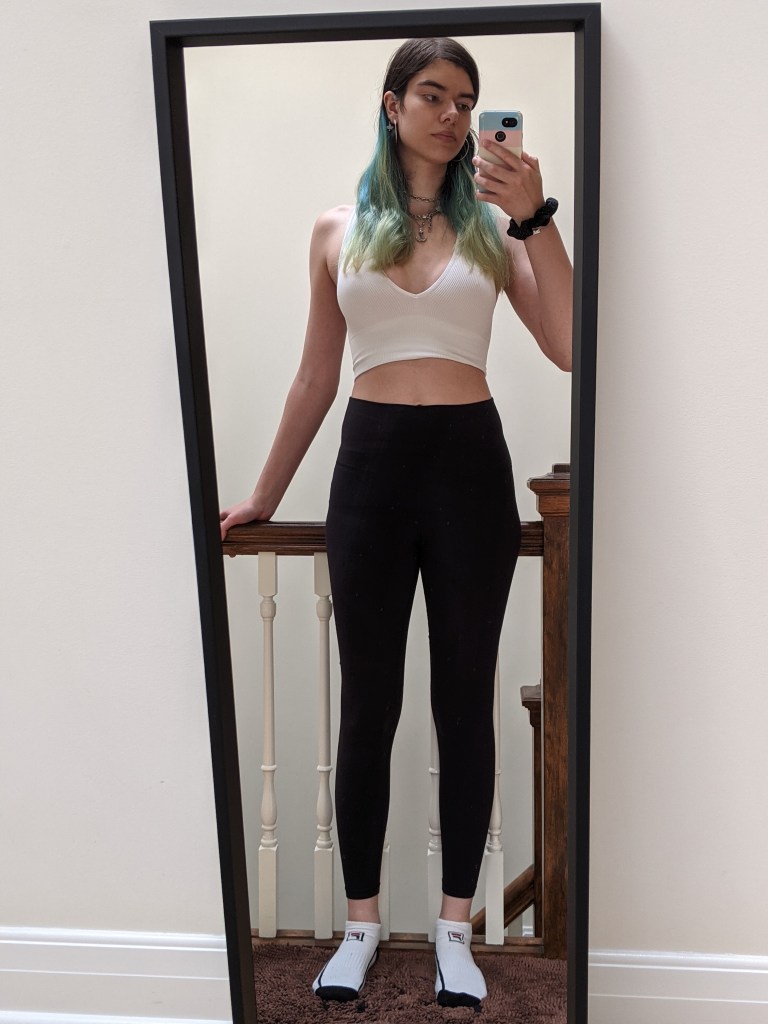 As you can see with the leggings here, they reach my ankles when wearing them as opposed to how they are when not stretched out. Same thing applies to the skinny jeans. (picture of holding skinny jeans while wearing them) Pro tip, when you wash your clothes if you wash them in warmer water it will ‘reset’ some of the spandex material back to its original form if you find that your item doesn’t fit like it used to or stretched it out. Keep in mind doing this will mean your clothes degrade faster.