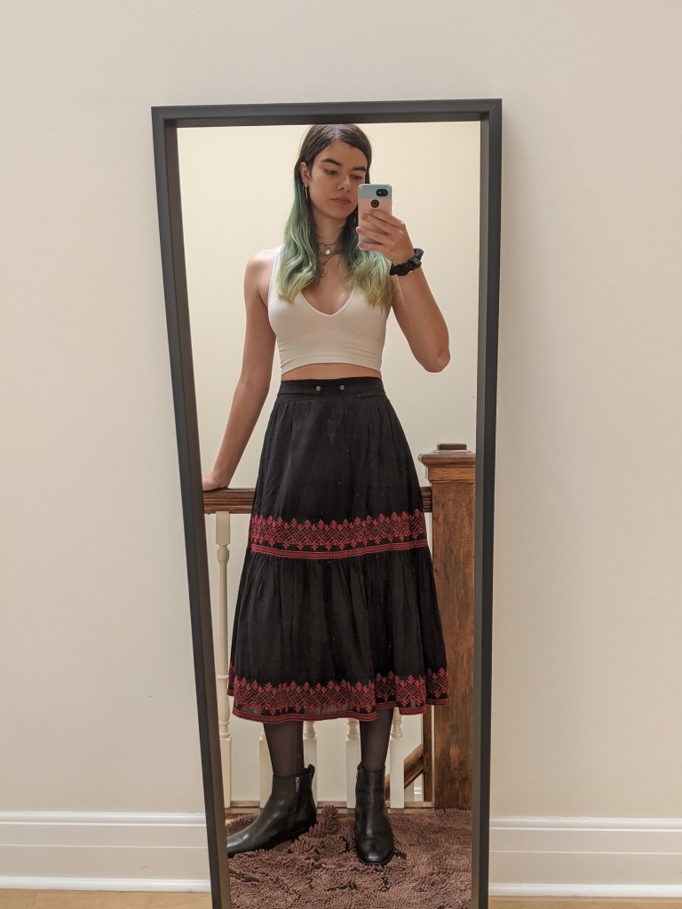 Showing your legs more often will get you used to seeing them. People who show skin are going to get gendered as female more often because of gender norms so as you get used to the idea of doing this, your height in general may end up bothering you less. Long legs are viewed as desirable so make of that what you will. Inseam doesn’t matter since as long as you style the skirt or dress well it won’t matter as opposed to pants. No one is going to say this skirt is too short on me because it’s intended to show my legs. When things look short unintentionally like with pants, it’s going to look careless. (picture red skirt)