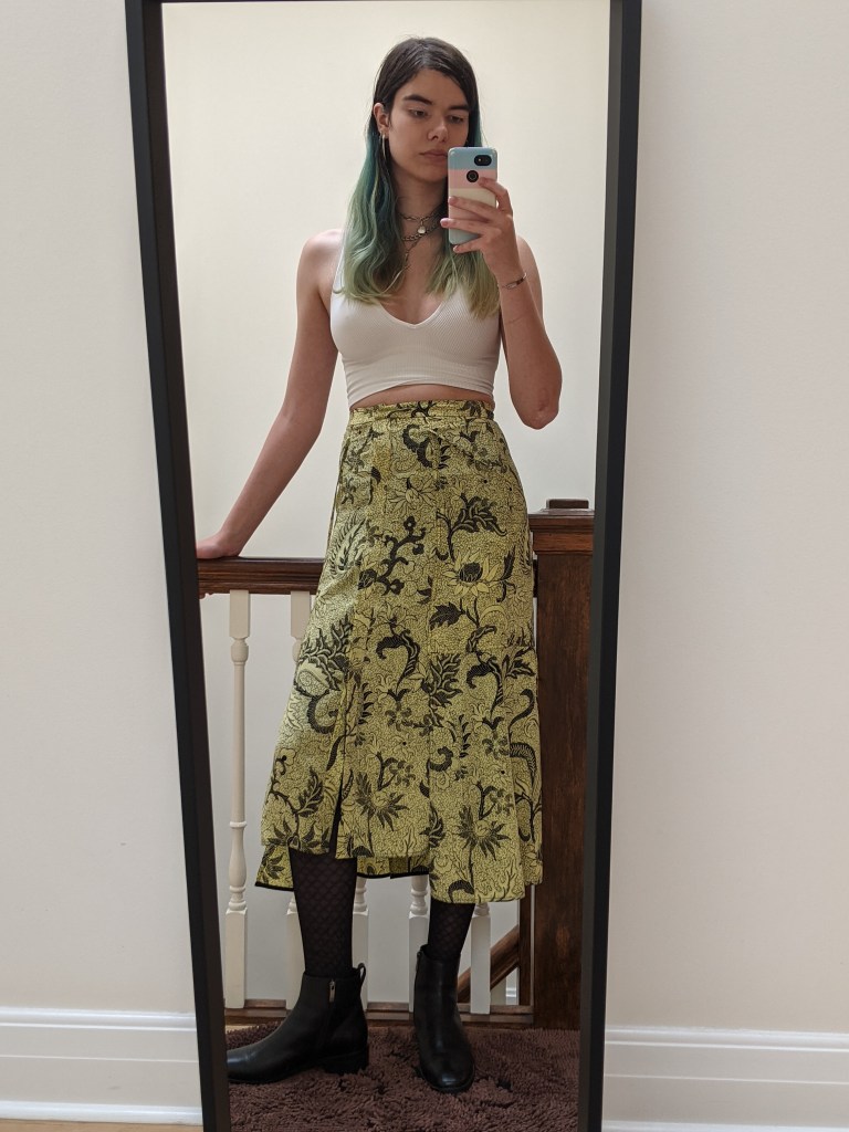 When I wear this yellow skirt you hardly see the stockings, so it doesn’t make much of an impact on the outfit. Contrast this with the shorter skirt and you can see what I mean.