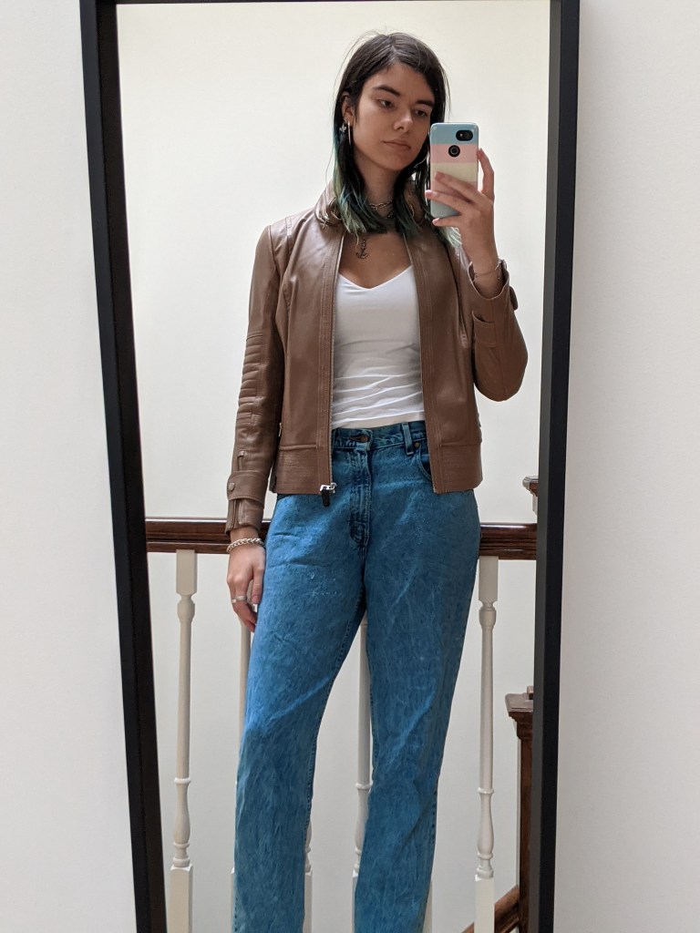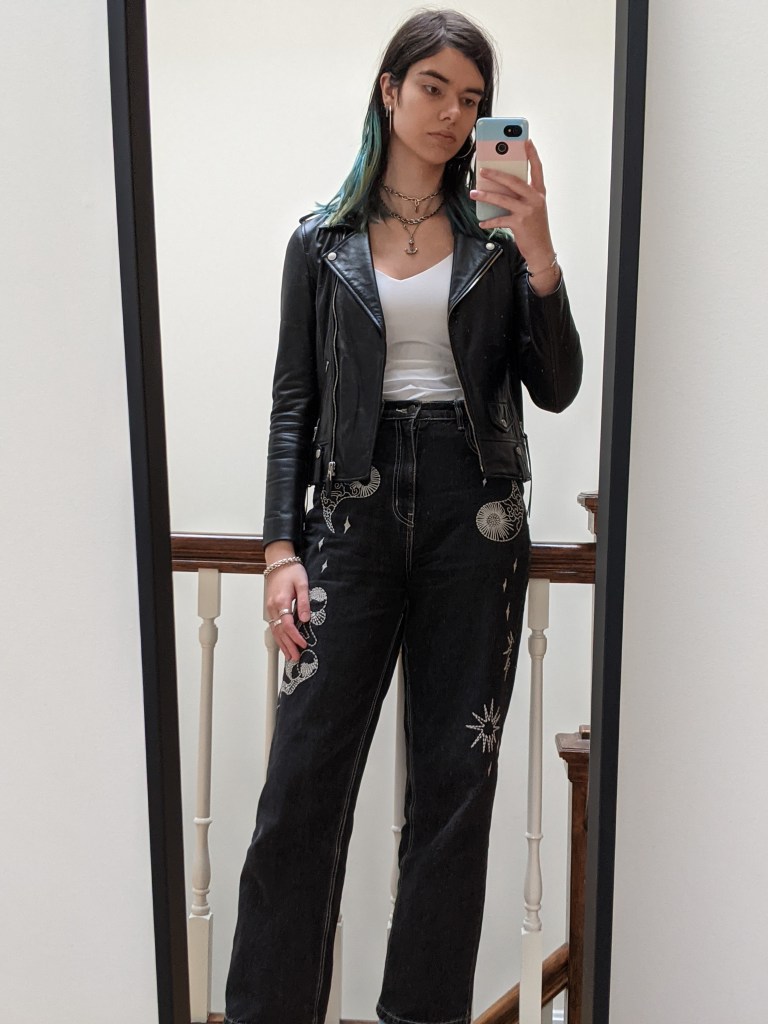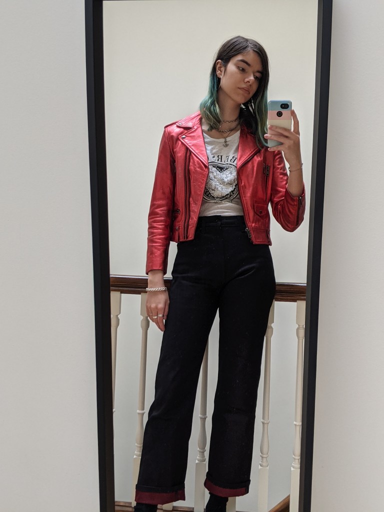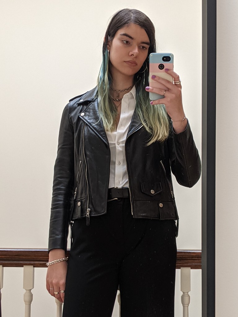 - Leather jackets are another solid choice that go with a lot and work at every level of study. Just ensure they fit you nicely (so not oversized) and don’t look like something designed to prevent you from dying after falling off a motorcycle.