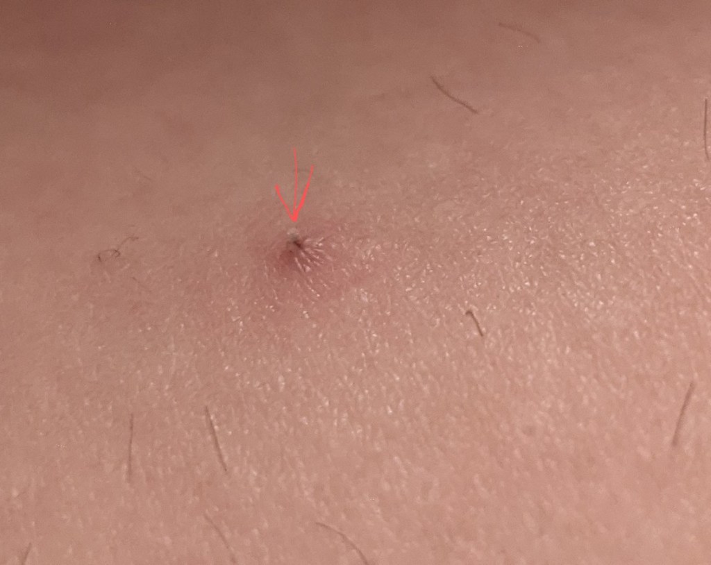This is an example of what it might look like, as you can see there seems to be a bit of skin peeking out of the hair follicle in the inflamed area. Afterward from pulling that skin which was clogging the follicle out a bit by using freshly disinfected tweezers (but not pulling out the hair) you can see how the skin has built up around the hair itself and the hair is actually much longer beneath the surface. The hair follicle may bleed a little bit so make sure you clean it and moisturize after to protect it! Again I don’t recommend doing this because it can lead to scarring.
