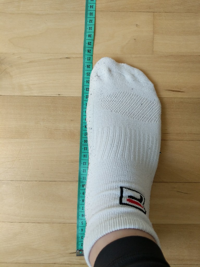 Feet is challenging because it is arguably where sizing varies the most across brands. I prefer to use European sizing for shoes because it is unisex. There’s a few things that matter for your feet. Take all of these measurements with your feet flat against the floor while wearing your typical socks. Standing is best but feel free to crouch over like a crab.