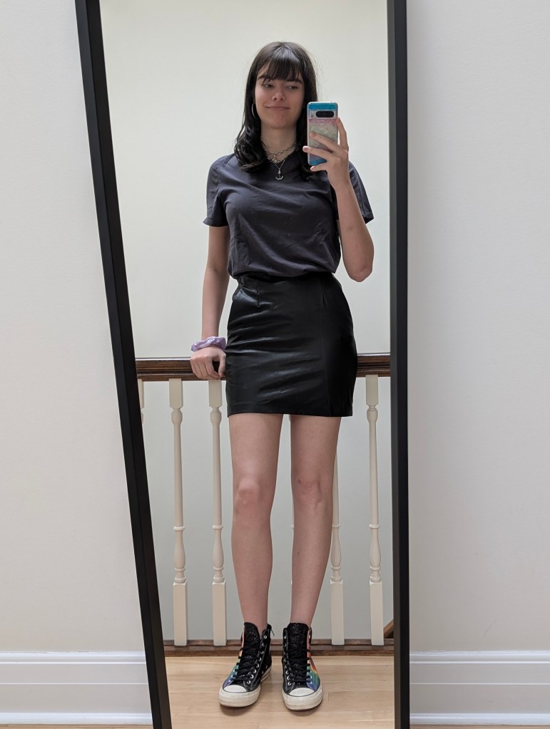 Obviously, not a great look! However because of the gender euphoria I felt wearing the skirt it blinded my better judgement and I wore this as you see it. There were plenty of other mistakes I made as well such as parting my hair WAY off to the side because that’s just how it grew in. I’m not necessarily saying you have to take things as slow as I did but also you should listen to the people around you, they’re usually not malicious!