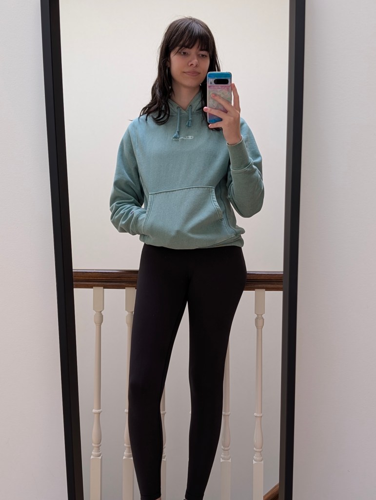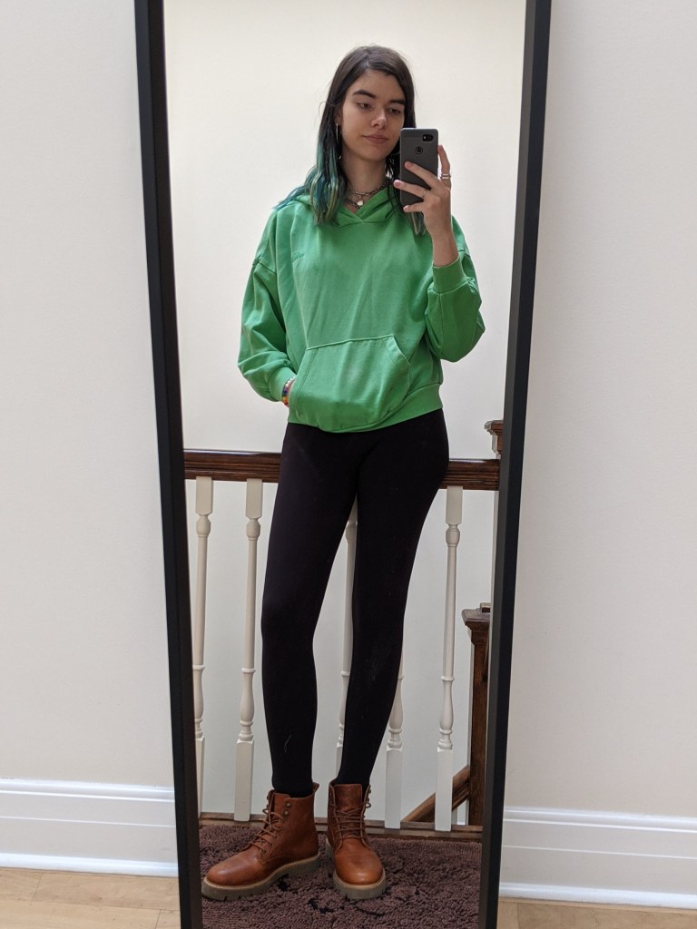 What do we notice as the common themes for these outfits? The lack of softer color. Colors are for women and gay people, except for red because that’s the color of blood and war and manly shit. Everyone knows this. So combine that with me being taller than 99% of people and it typically ends up being a coin flip on getting gendered correctly. People address me as a woman after hearing me speak so the point is proven that looks can be deceiving. Depending on how you swing it, you could wear bright colors to make things more feminine, or no color/neutrals only to make the overall vibe more masculine as the dark and brooding aura signals something other than women who are 100% joyful and pleasant looking at all times. Compare these 2 tones of green hoodies, which one seem more feminine despite the silhouettes?