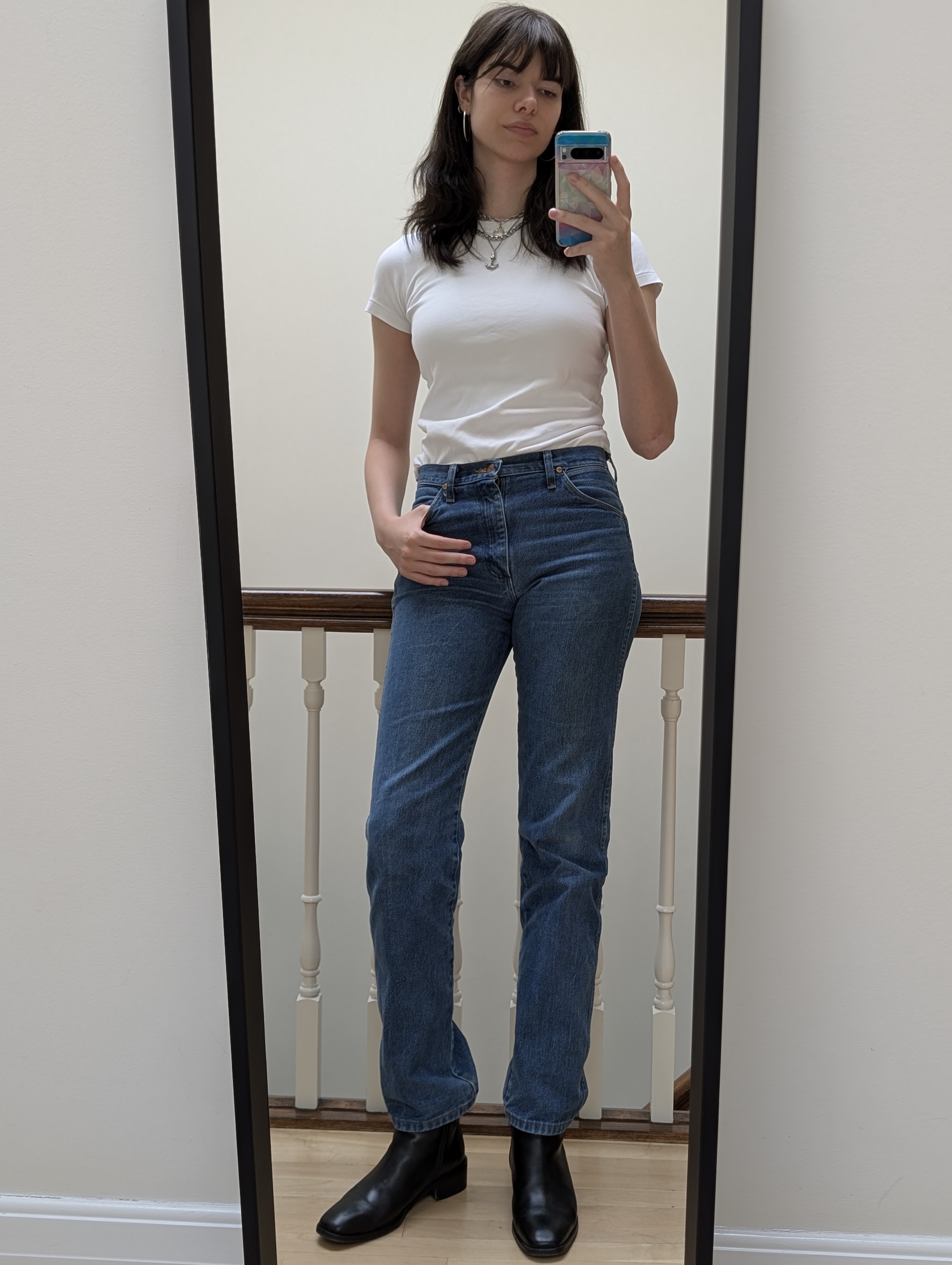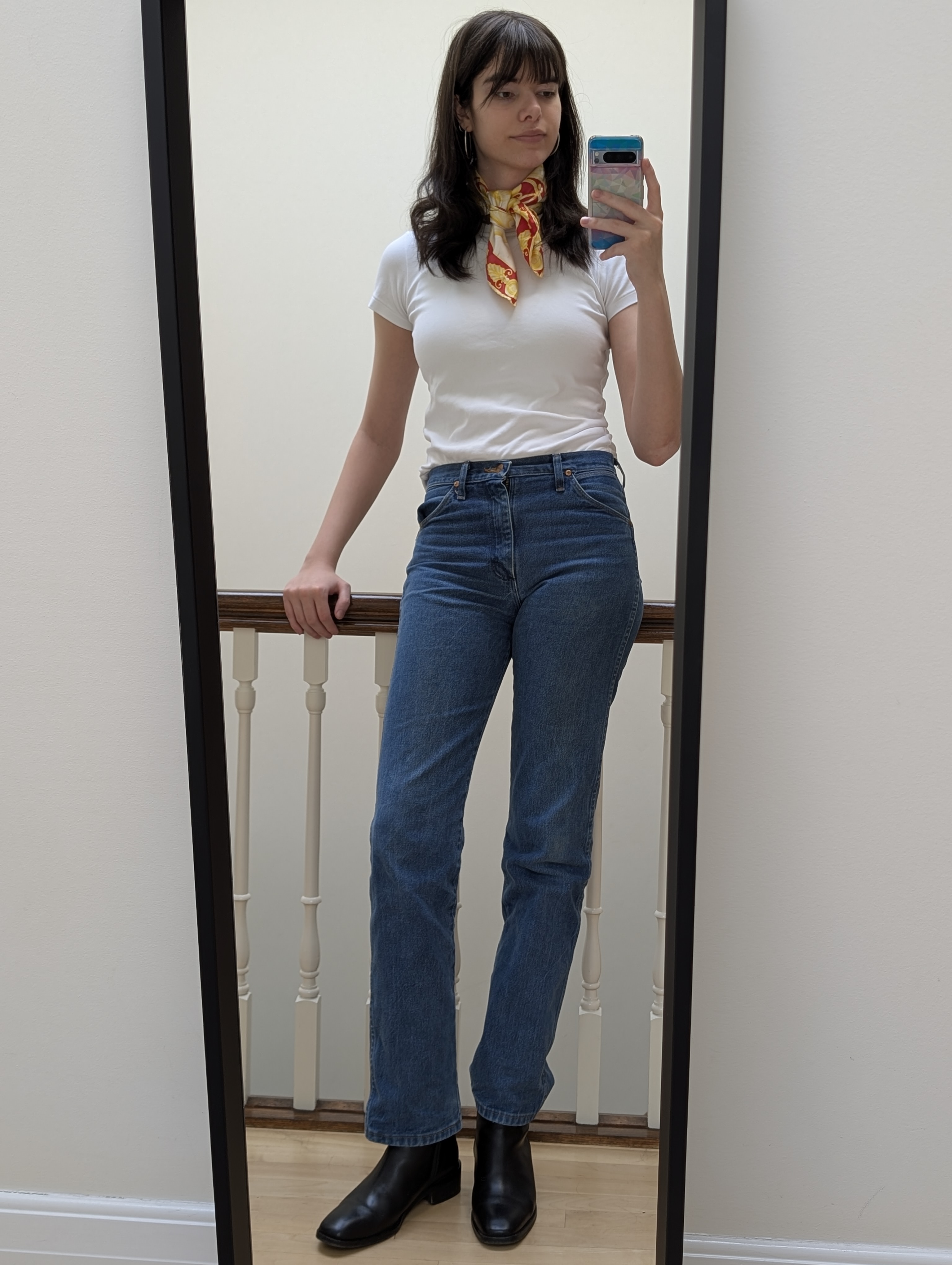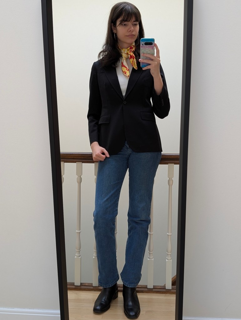 Let’s remove my body shape from the equation and just wear a white shirt and blue jeans. If you wanted to up the feminine touch of your outfit, you could put on the scarf! Same goes for with a blazer.