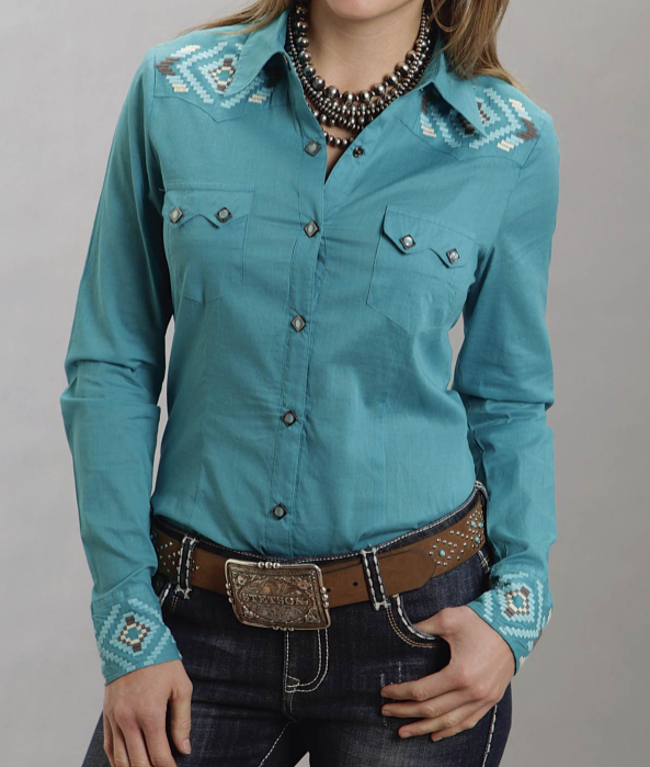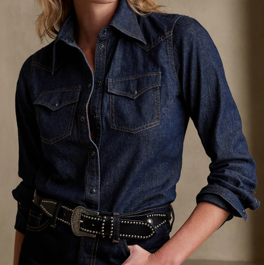 Western shirt – A cowboy inspired shirt typically made of denim, suede, or leather. Characterized by snap buttons and 2 triangle pockets on the chest. Almost always a button up shirt with a collar. Frequently features decorative embroidery along the garment.