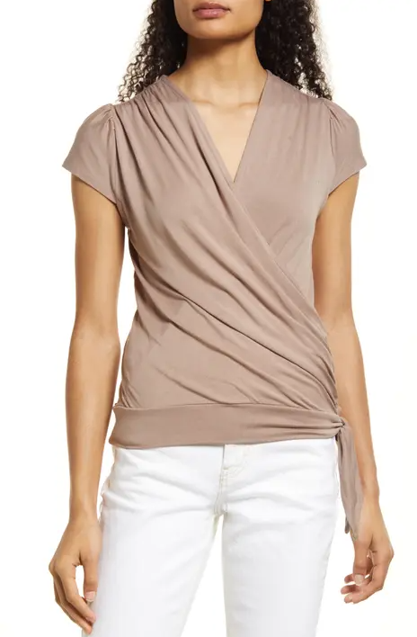 Wrap top – Similar to tie front tops where you wrap an open top around your body to close it. Can often include a belt made of the same fabric to close it.